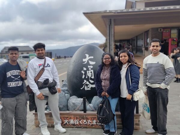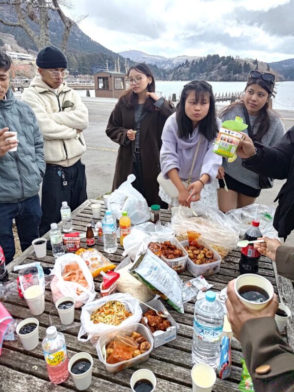 そこから箱根に向かい、箱根神社にお参りして、お昼ご飯の後は大きな遊覧船に乗ってのんびり過ごしました。船を降りた後は、火山活動を目の前に感じられる大涌谷を見学。大涌谷の名物は「黒たまご」です。